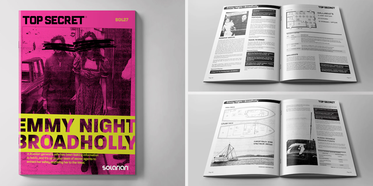 | A Russian general’s wife has been leaking information to NATO, and it’s up to your team of secret agents to extract her safely and bring her to the West. Emmy Night / Broadholly is the new mission module for Top Secret by Scott Kongable. The first print run is nearly sold out, get your copy now!