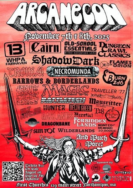 | Dear Fellow Travellers, I come to bring news of a convention in western Massachusetts called ArcaneCon! A convention that celebrates indie games within the old-school, new school, and other schools! Some fellow union folks will be there running games! In the lead up to the event, I’ll be providing some stand out games I’m excited to see at the convention this year! For my first article, I’d like to point everyone towards Barrows & Borderlands: |