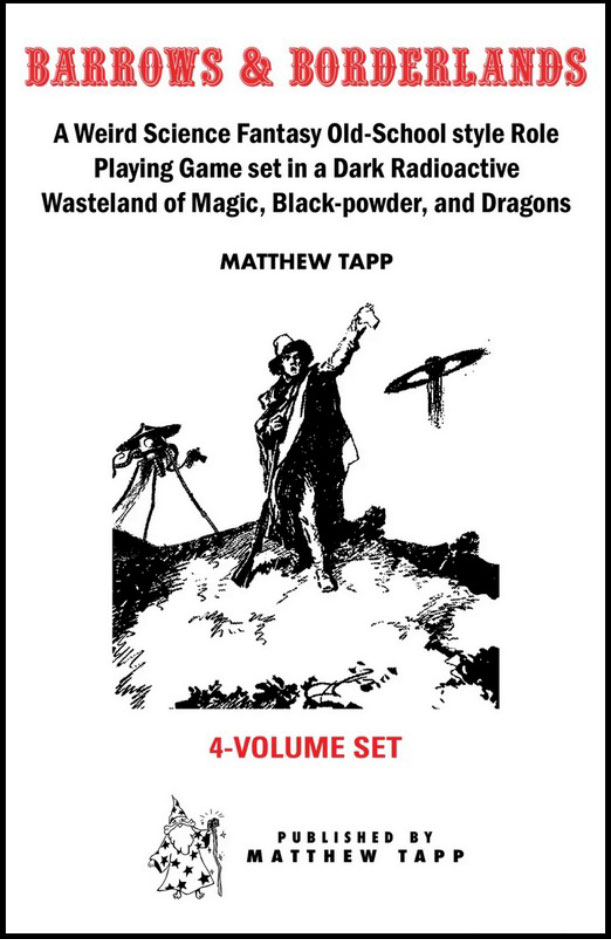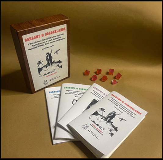 | Now THIS is a landmark of a game, taking influence from the less appreciated corners of Original D&D and giving it some OSR flavor to make it feel like original D&D from an alternative universe. It’s everything I like from the landmark booklets from 1974, but plussed up by leaning into the more weirdo elements that inspired the game. Everything from the layout, fonts used, original artwork and even the boxset you can purchase is a masterpiece. This game is a celebration of OD&D and the weirder parts that seem to get overlooked (Dinosaurs! Psionics! Rayguns!) that have unfortunately been pushed aside. There is even an original map inspired by the wilderness survival board game (as a separate product!) I’m extremely excited to have the creator driving all the way up to ArcaneCon to run the game. And in true OD&D fashion, his player cap is 10 players! So if you’re looking for something to play Saturday Afternoon at the convention, look no further than Barrows & Borderlands! |