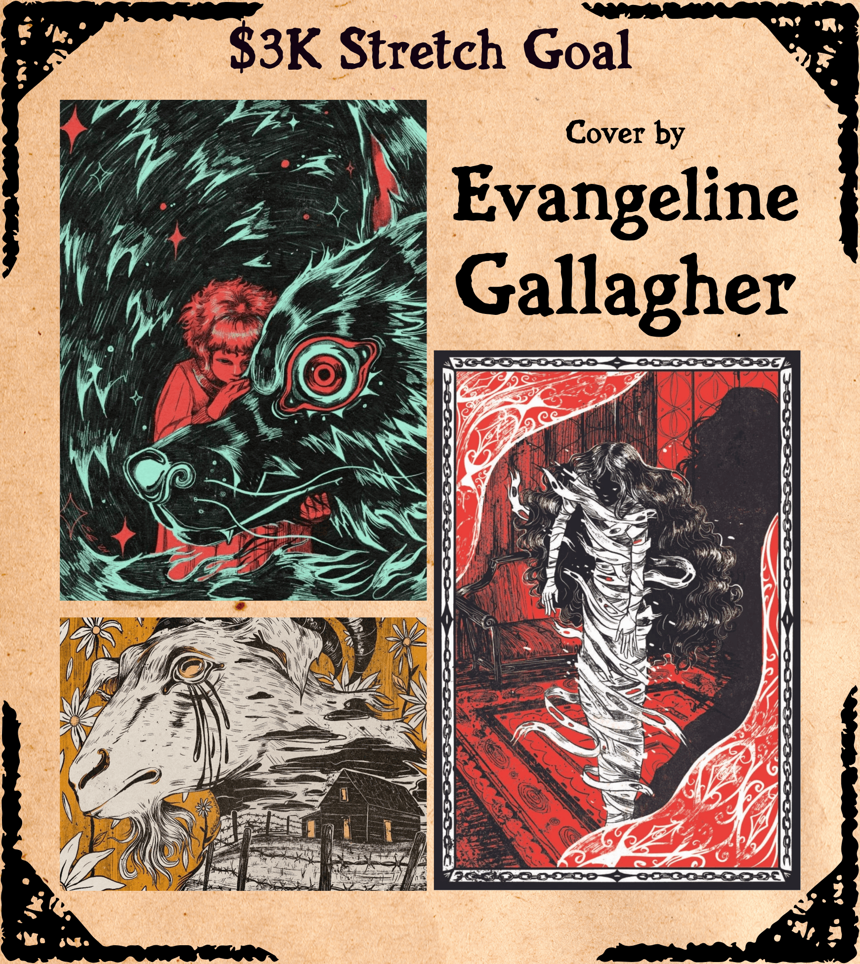 We cannot thank you all enough for your support; it means the world, and it means we can bring Under the Shadow of the Noon-Day Witch to life. It’s humbling and an absolute privilege to have people like you supporting us as we create these weird bits of art and adventure, so thank you. We’re so pumped that we decided to add a stretch goal, and this one’s a killer. Once we cross the $3K threshold, we are going to bring Evangeline Gallagher aboard the project to illustrate the cover for the Hardcover Edition of Under the Shadow of the Noon-Day Witch.