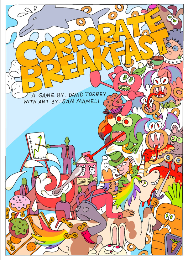 Oh! Before I forget, I want to tell everyone about Corporate Breakfast! A game created by David Torrey with art by Sam Mameli! |  | “Welcome to the Corporate Breakfast Corporation! We are happy to have you as the newest member of our breakfast cereal naming team, it’s a vacancy well overdue to be filled! Our naming techniques have gone stale so we are introducing a new method. We will give you a hand of random words and allow you to swap out some to come up with the best name and pitch! Once you present it to the board, they will decide on which name is the best one to move forward with. If they select yours, congratulations! It is a major honor that comes with huge bragging rights!”